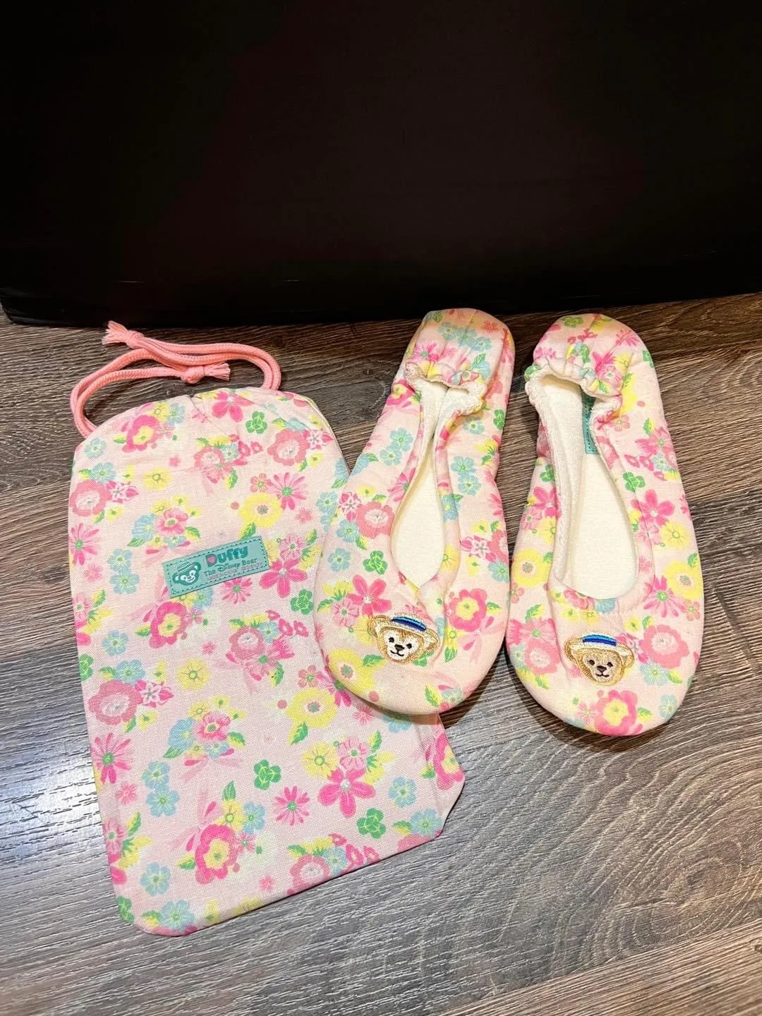 東京 迪士尼 DUFFY 春季 粉底花 室內拖鞋+收納袋 23-24.5cm