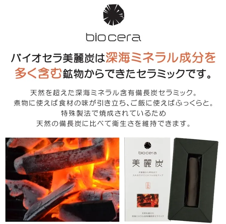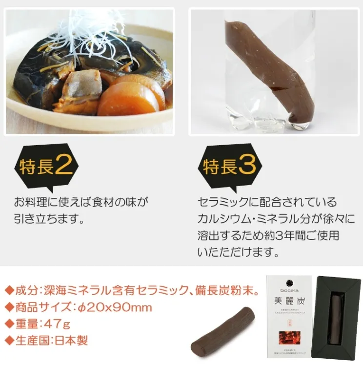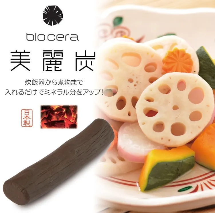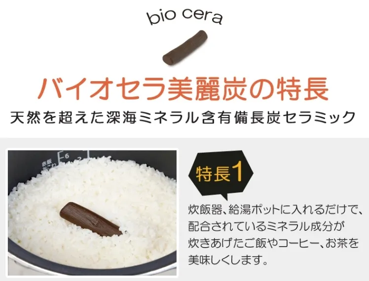 備長炭陶瓷含有超過天然礦物質的深海礦物質。用它來燉菜可以帶出食材的味道,用它來米飯可以讓米飯更鬆軟。由於採用特殊的製造方法燒製而成,因此比天然備長炭更衛生。Biocera美麗木炭是一種由含有多種深海礦物成分的礦物質製成的陶瓷。只需將它添加到電鍋或熱水鍋中,礦物質成分就會讓您煮出的米飯、咖啡和茶變得美味。陶瓷中所含的鈣和礦物質逐漸溶解,因此可以使用3年左右。