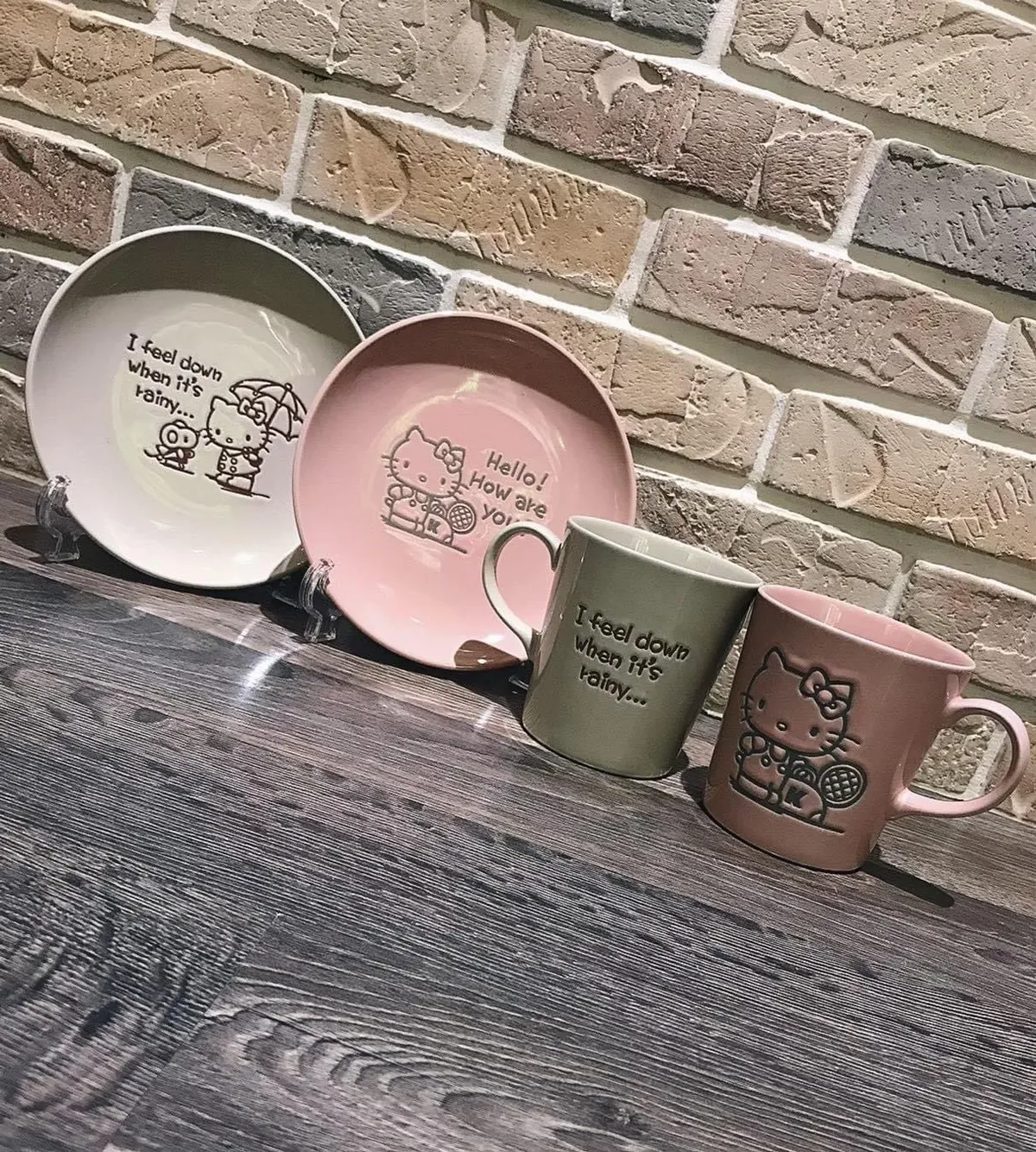 日本製 Kitty 米灰&粉 2盤+2杯 組