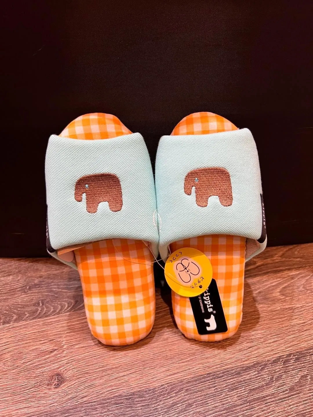日本 兒童 藍底大象 橘色格子 魚口 室內拖鞋 21-23cm